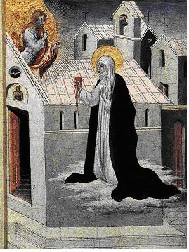 Nach einer außerkörperlichen Erfahrung, wie wir sie aus Berichten von Menschen kennen, die eine Nahtoderfahrung hatten, begann das politische Wirken Katharinas, das eine Reform der Kirche zum Ziel hatte. Ihre innige Beziehung zu Jesus hat ihr für ihr mutiges Handeln die innere Stärke gegeben. Aus ihr hat sie ganz gelebt. In einer der letzten Visionen, die auf dem Bild zu sehen ist, beschrieb sie, wie sie ihr Herz freiwillig der Kirche schenkt. In diesem Glauben starb sie am 29. April 1380 mit 33 Jahren.