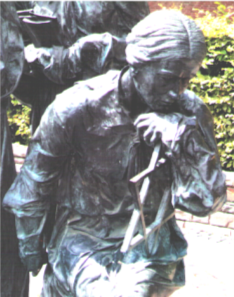 Wenn Sie sich das erste Foto anschauen, sehen sie die zweite Plastik in der Mitte, eine junge Frau mit einem gespaltenen Kopf. Im Evangelium zu Ihrer Heiligsprechung finden wir folgenden Satz: Ihr betet an, was ihr nicht kennt, wir beten an, was wir kennen; denn das Heil kommt von den Juden.(Joh 4,21). Es ist ihr sicherlich nicht leicht gefallen, ihren jüdischen Familienglauben aufzugeben. Jesus war doch auch ein Jude. Die ersten Christen – alle Apostel – waren Juden. Uns dagegen fällt es schwer, diesen Satz auch für uns zu akzeptieren. Bei der Vorbereitung einer Messe mit diesem Evangelium, bat mich eine Frau aus dem Team, diesen Satz auszulassen. So unerträglich schien er ihr! Der gespaltete Kopf steht wohl als Symbol für diesen inneren Zwiespalt bis in ihren Tod.