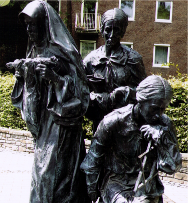 Ich zeige Ihnen hier das Foto von einer Plastik, die in Köln in der Nähe vieler großer Banken zu Ehren von Edith Stein aufgestellt wurde. Hier stehen die Schätze der Welt den Schätzen im Himmel gegenüber. Das Foto zeigt Edith Stein dreimal, in drei verschiedenen Lebensphasen. Ich habe dieses Foto gemacht, um zu zeigen, dass sie nicht nur als Märtyrin gesehen werden sollte. Ihr ganzes Leben war eine Suche nach Gott. Doch dann fand sie in einem tiefen Glauben an Gott ihre Ruhe und Gelassenheit.