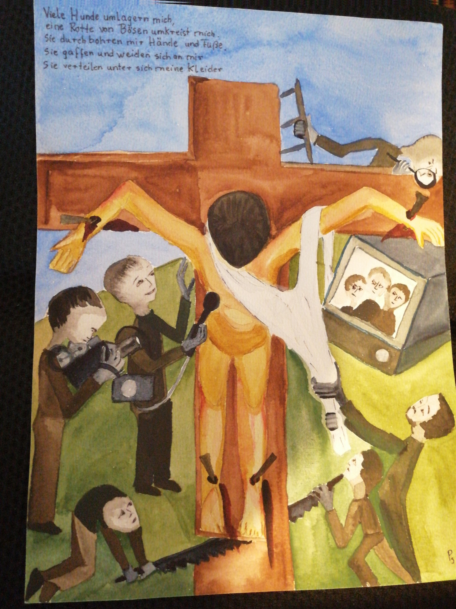 Den Vers 17 und 19 habe ich in diesem Bild versucht darzustellen. So werden viele Menschen an ihrer Arbeits-Stelle gequält. Die Gesichter zeigen auf keine Weise Mitleid, kein Gefühl, stattdessen: Grinsen, Gleichgültigkeit, Medien Aufmerksamkeit, Sachlichkeit.